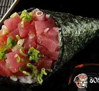 Alga, arroz, atum fresco, maionese, tabasco e cebolinha.