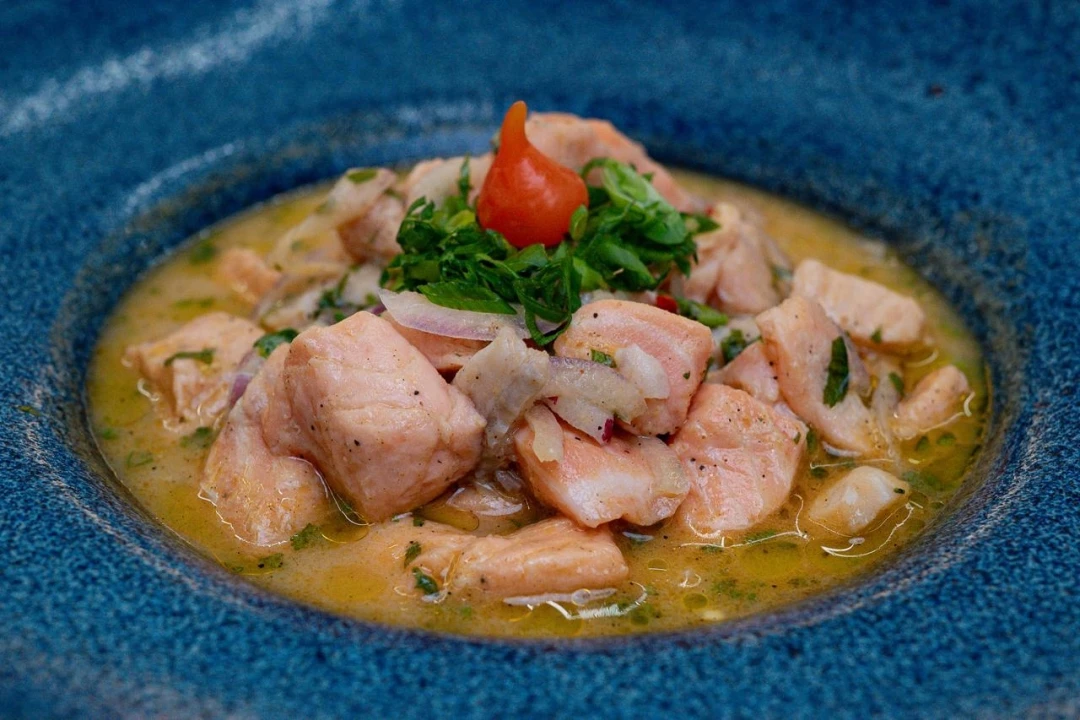 Iscas de peixes variados, limão, tabasco, pimenta dedo de moça, cebola roxa, coentro e temperos.